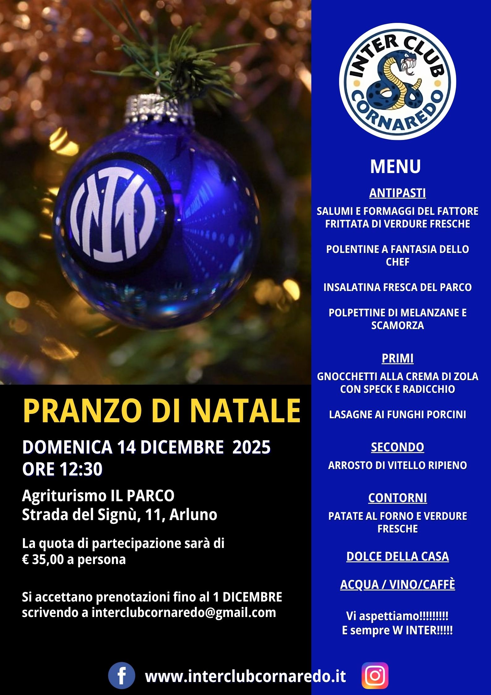 L’Inter Club Cornaredo, organizza per il giorno Domenica 14 Dicembre 2025 alle ore 12:30 un Pranzo di Natale.